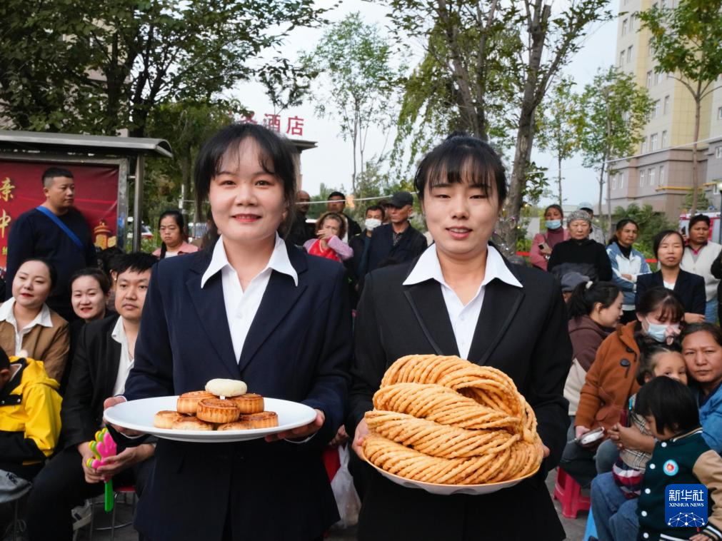 9月13日,乌鲁木齐米东区地磅街道举办迎中秋活动,工作人员展示为居民准备的馓子、月饼。