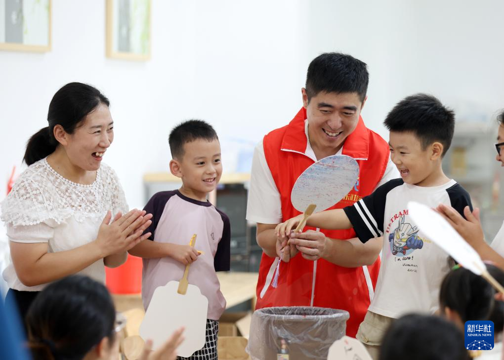 9月14日,山东省临沂市郯城县郯城街道府东社区志愿者在教孩子制作团扇。