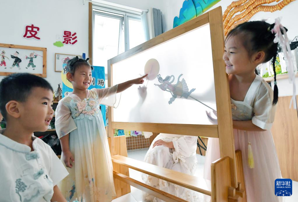 9月14日,河北省石家庄市桥西区际华苑幼儿园的小朋友表演皮影戏《嫦娥奔月》。
