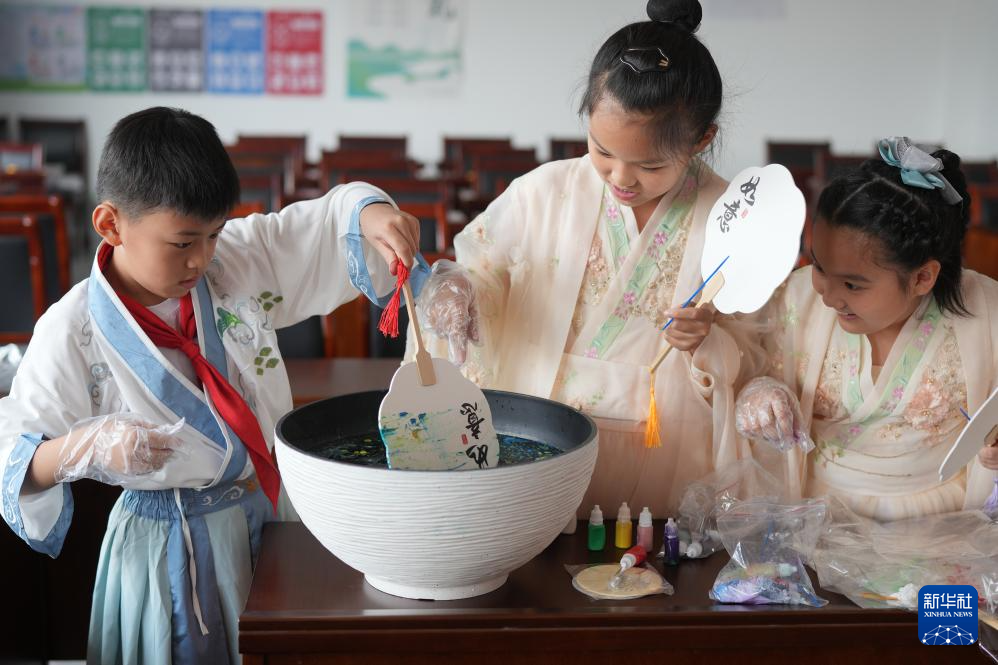 9月14日,在浙江省绍兴市越城区陶堰街道,小学生自己动手体验漆扇制作。