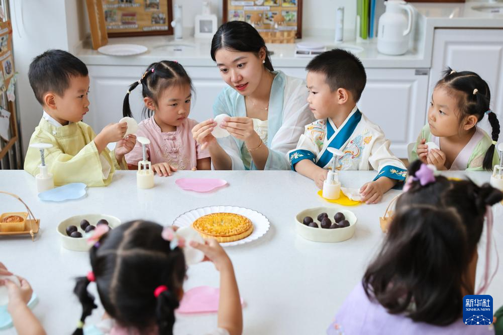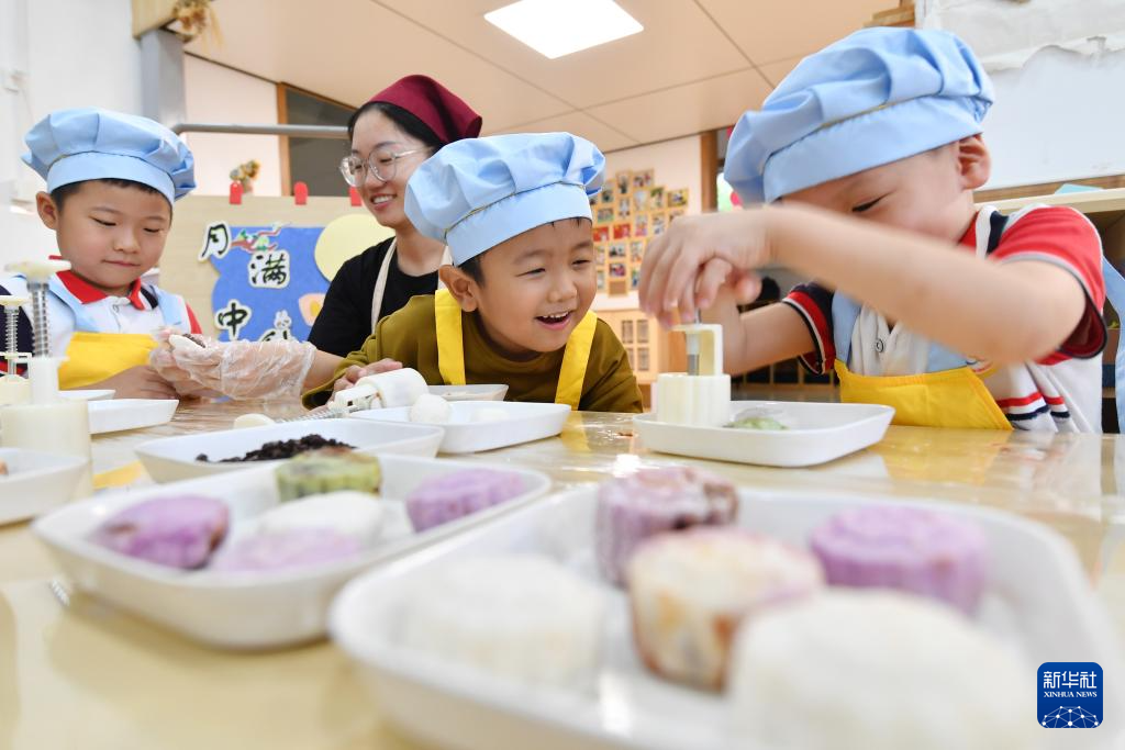 9月13日,在南京市安德门幼儿园,小朋友在老师的指导下学习做月饼。