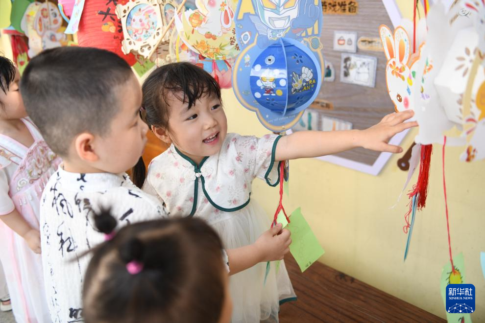 9月14日,江苏省淮安生态文旅区文锦苑幼儿园小朋友展示中秋灯笼。