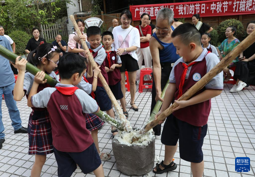 9月14日,四川省广安市西溪社区举行迎中秋活动,小学生在活动中体验打糍粑。