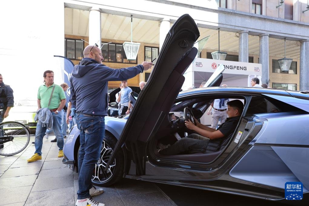 9月13日,在意大利都灵罗马街,人们在东风汽车展位参观。