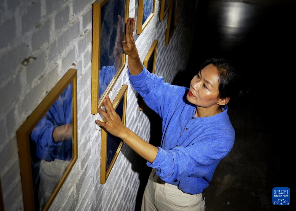 王丹凤在位于洛阳栾川的一家染文化民宿内整理粗布印染的装饰画(9月13日摄)。