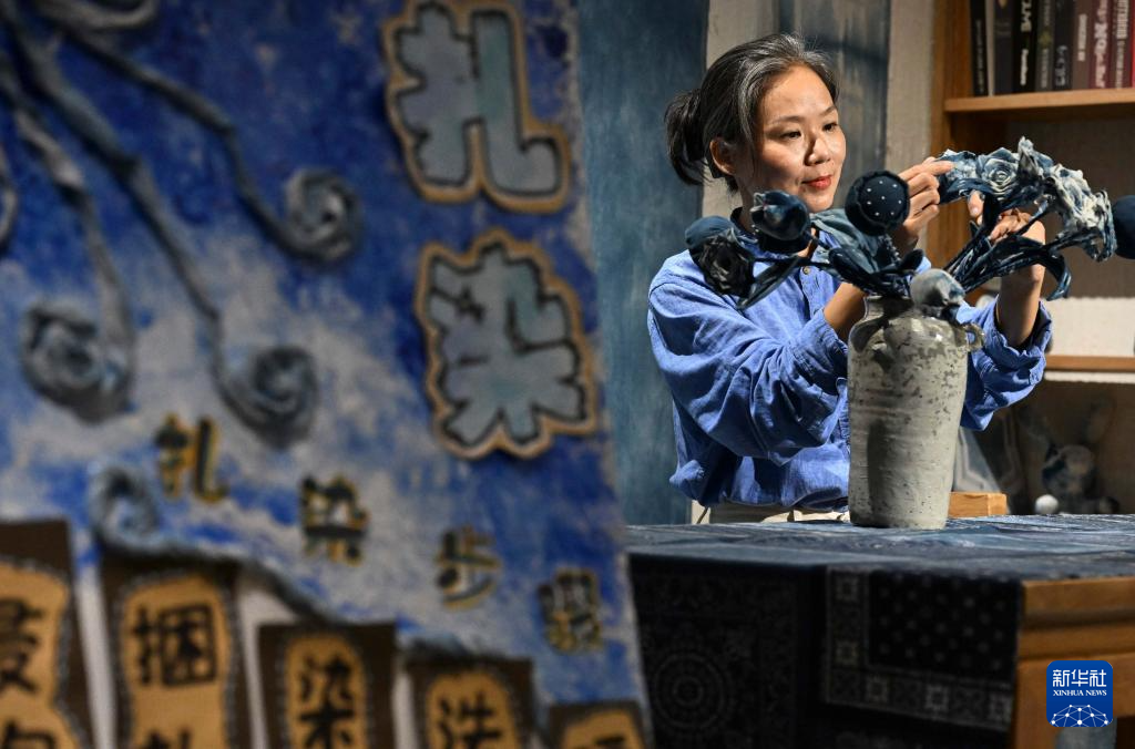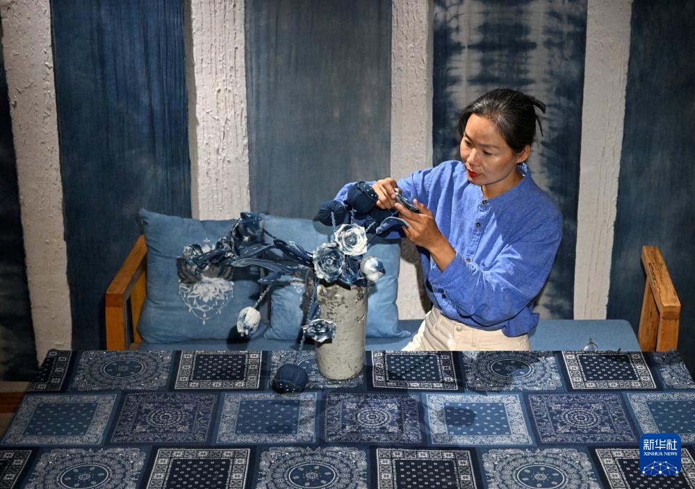 王丹凤在位于洛阳栾川的一家染文化民宿内整理布染花朵(9月13日摄)。