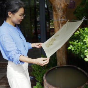 “80后”王丹凤自幼喜爱传统文化,她在偶然间接触到传统手工印染技艺,其色泽柔和、变化万千的特点令她着迷。通过多年拜师学艺,用心琢磨,她将洛阳栾川地区丰富的亦药亦染的植物作为原料,通过浸泡、捆扎、染色、洗净、晾干等步骤,将大自然的颜色“搬运”到织物上,赋予染品一种独特的自然美感和色泽变化。