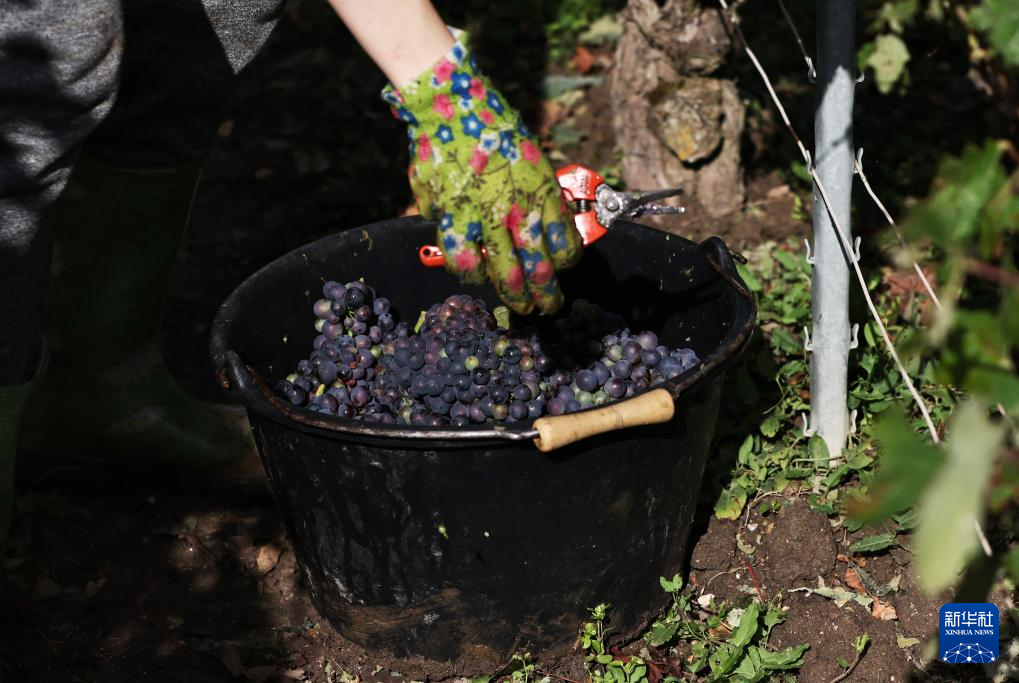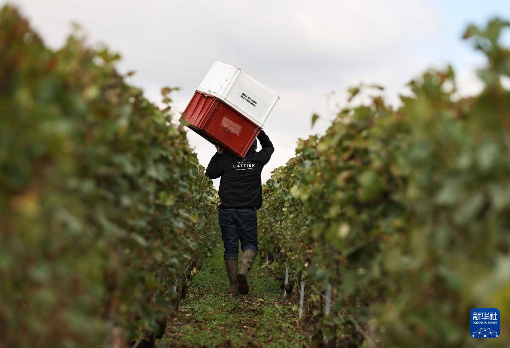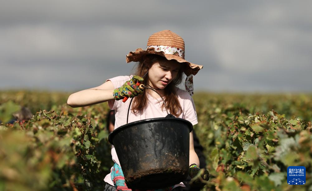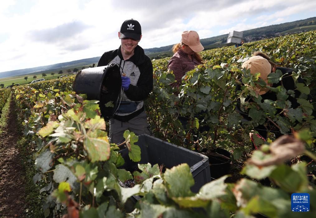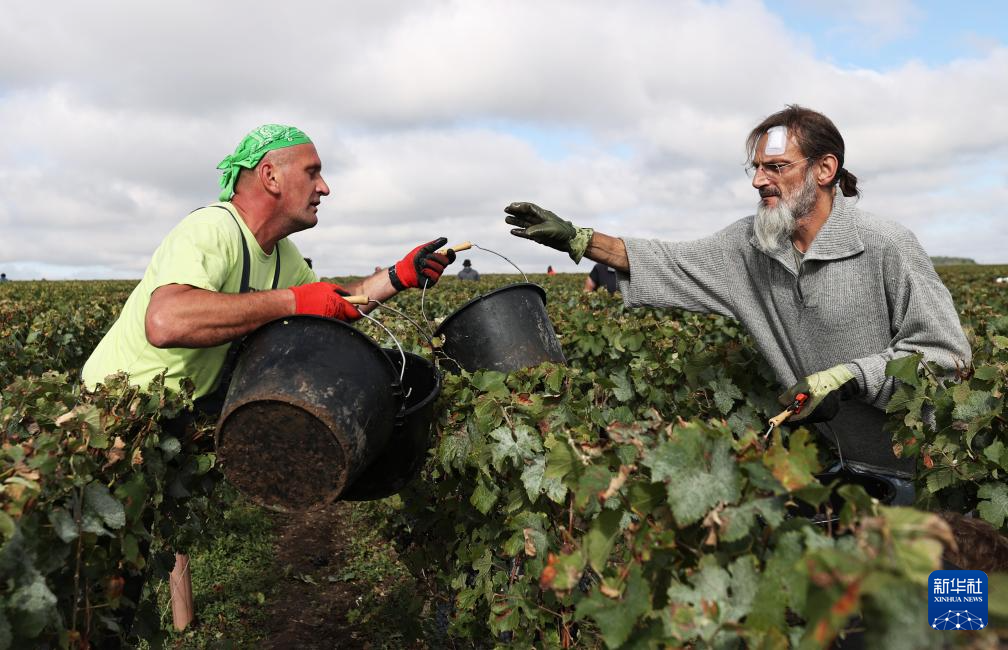 9月13日,在法国兰斯附近的希尼莱罗斯,工人在葡萄地里采摘葡萄。