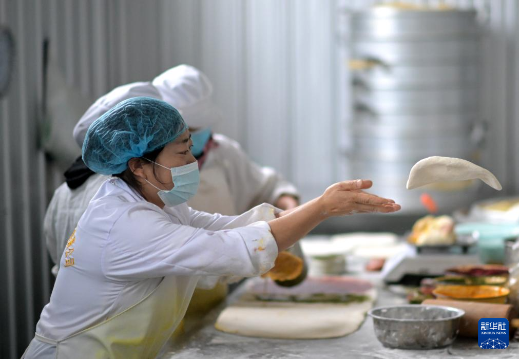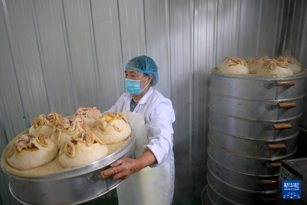 9月15日,在青海省海东市互助土族自治县东山乡白牙合村,土族群众贲永琴取下蒸好的月饼。
