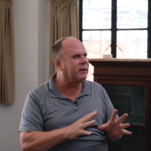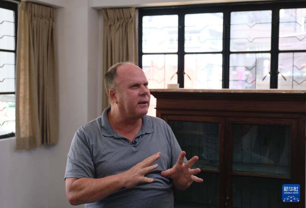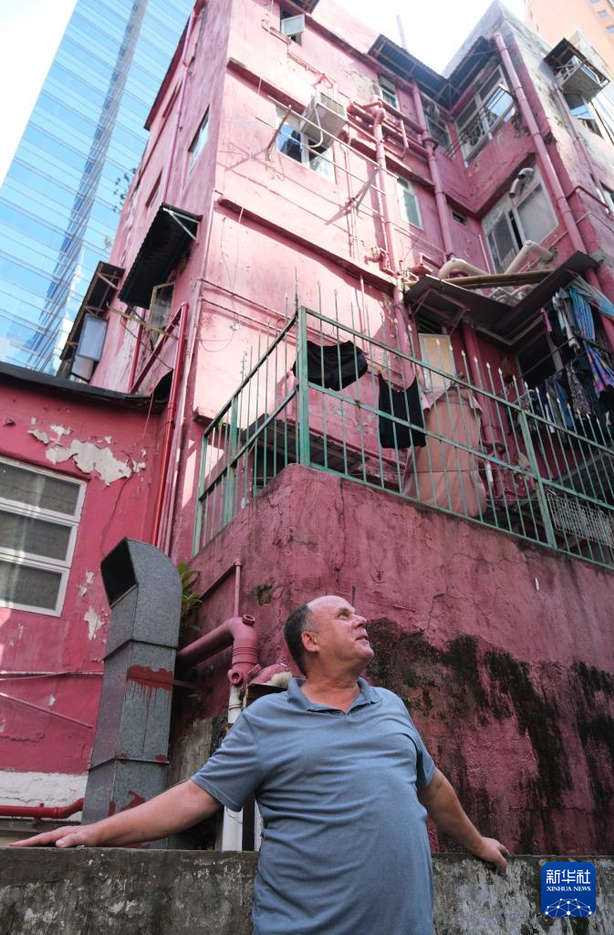 62岁的纽约客戴尔·科斯洛在香港一栋50多年历史的唐楼中接受新华社记者采访(7月5日摄)。