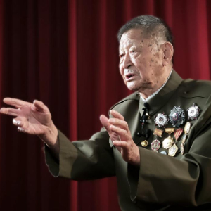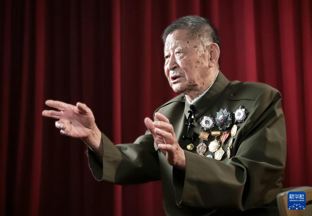 黄宗德接受采访时讲述自己的战斗经历(2024年9月10日摄)。