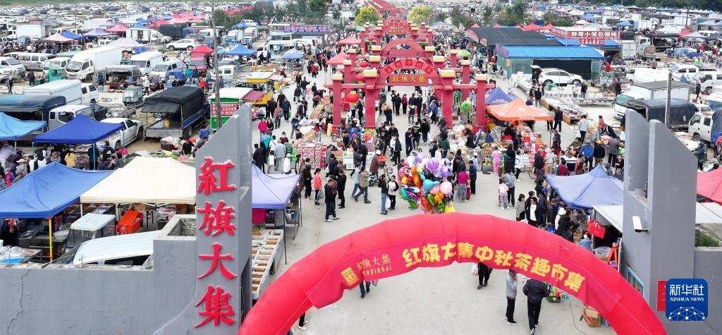 9月15日,游客和市民在红旗大集上逛集(无人机照片)。