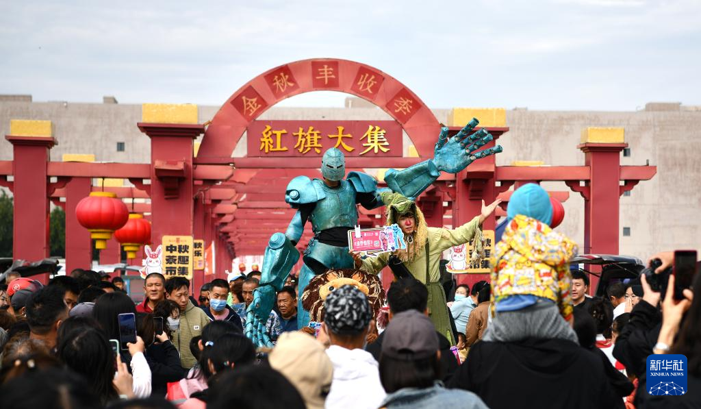 9月15日,市民和游客在红旗大集上观看舞台上表演的东北大鼓。