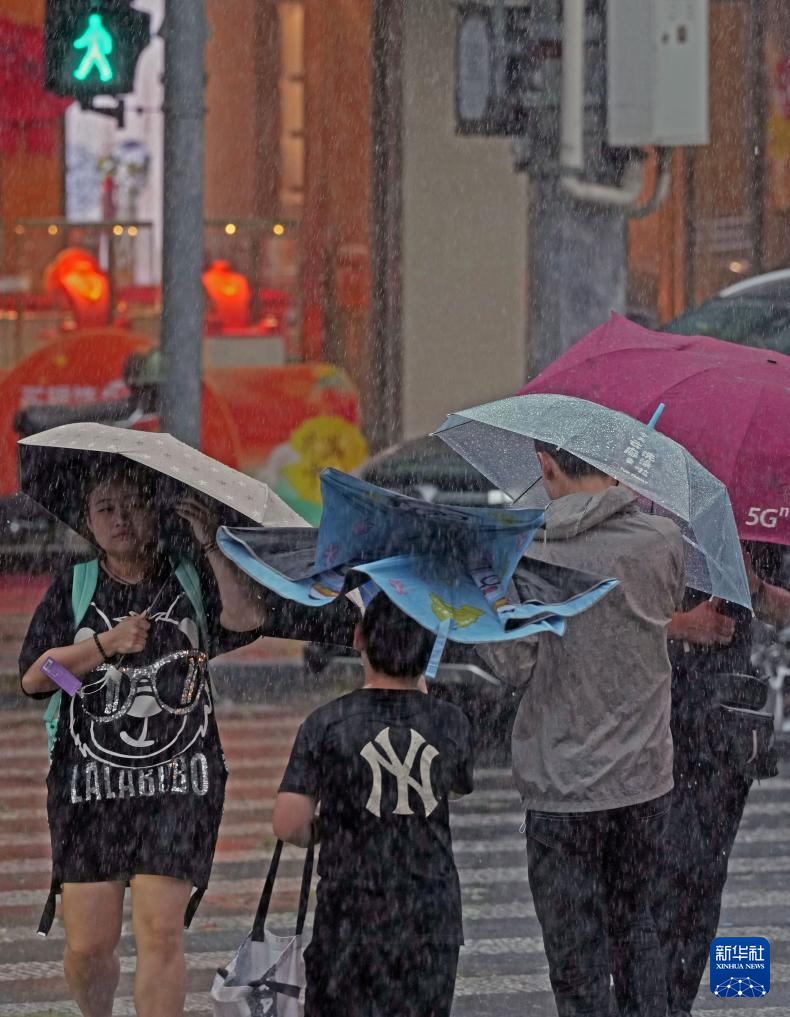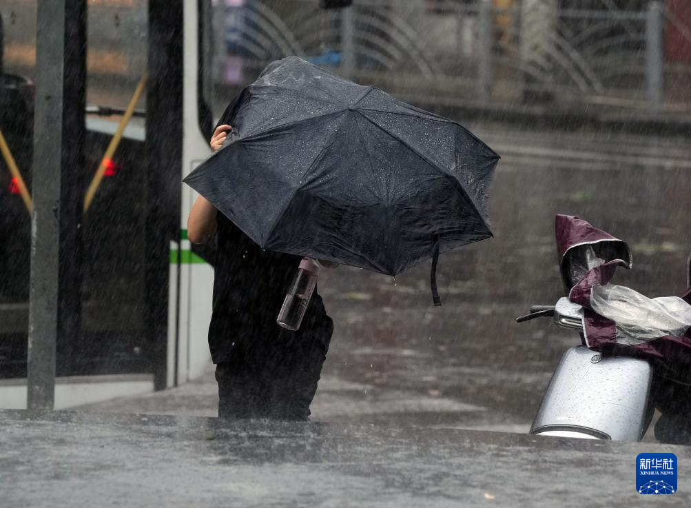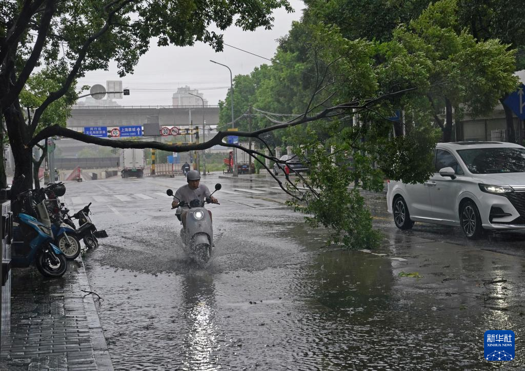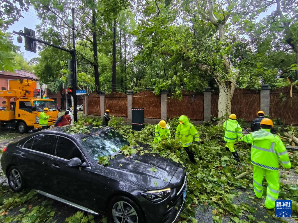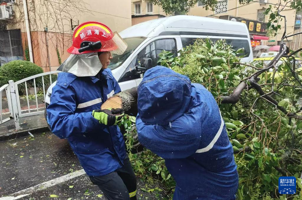 9月16日,上海长宁消防救援支队消防员在移除被风吹倒阻碍交通的树木。
