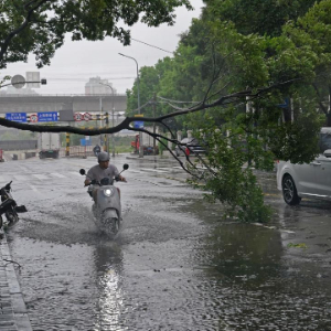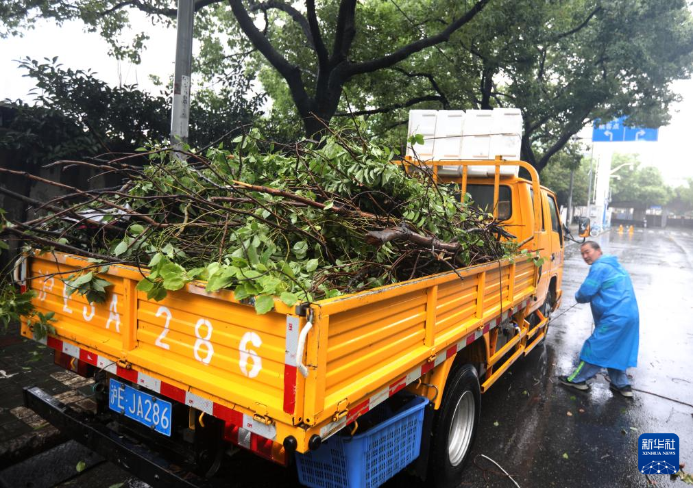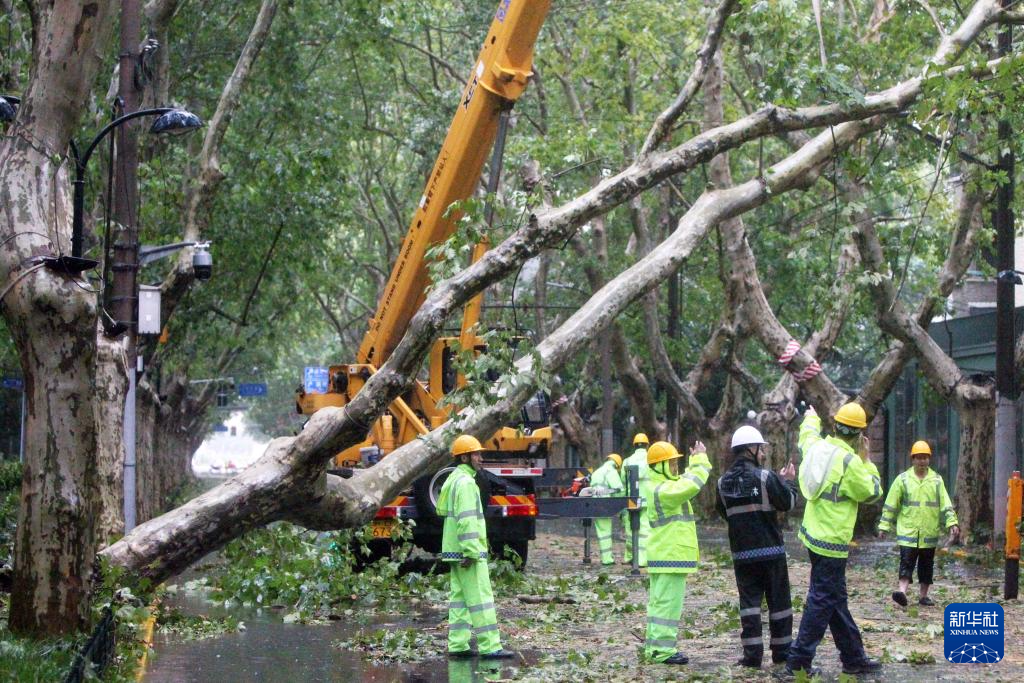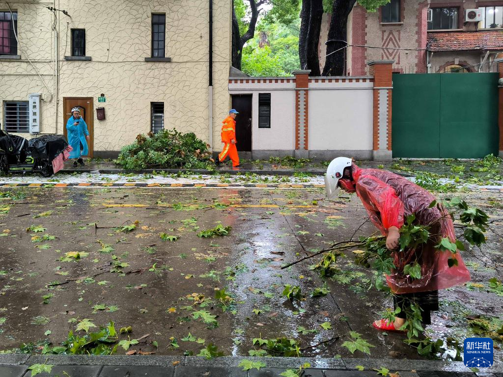 9月16日,在上海市徐汇区永嘉路上,工作人员在清理被风吹到路面上的树枝。