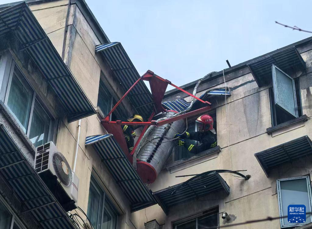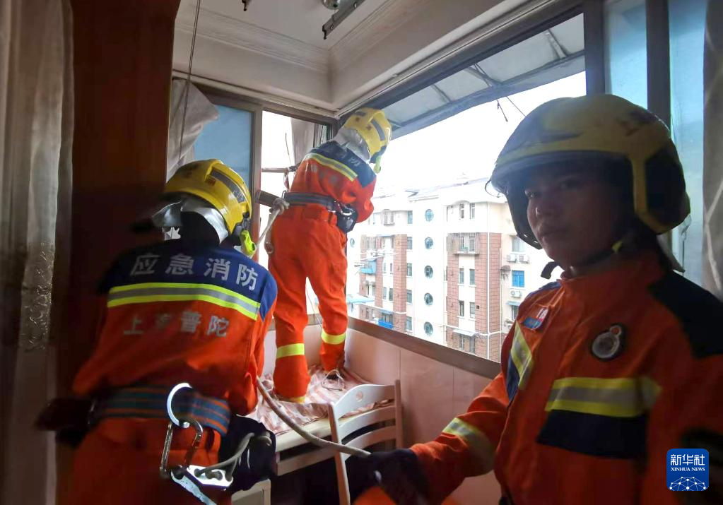 9月16日,上海普陀消防救援支队消防员用绳索对居民家中脱落雨棚进行加固。