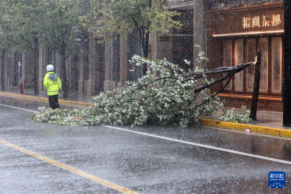 9月16日,上海长宁消防救援支队消防员在移除被风吹倒的树木。