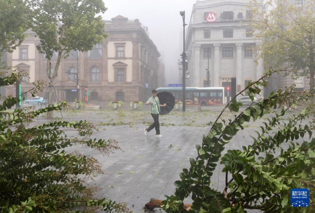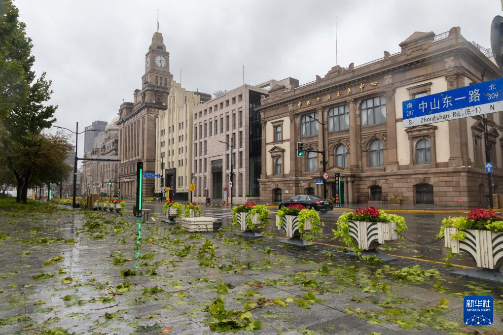 上海外滩附近道路落满吹落的枝叶(9月16日摄)。
