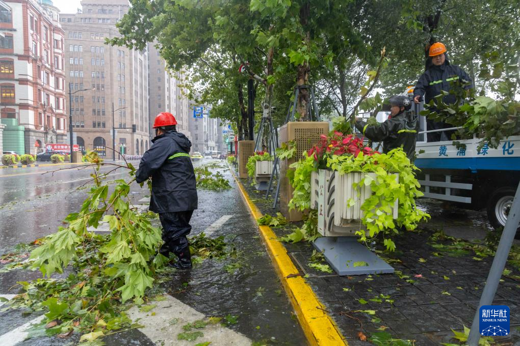 9月16日,在上海中山东一路上,工作人员在清理吹落折断的树枝。