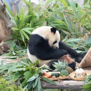 当日,在位于青海省西宁市城西区的西宁熊猫馆,饲养员用菠萝、玉米、西兰花、竹子等食材为馆里的4只大熊猫准备了丰盛的节日大餐。