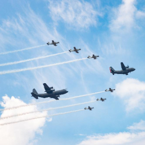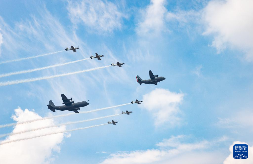 9月16日,在墨西哥首都墨西哥城,参加阅兵式的飞机飞过宪法广场上空。