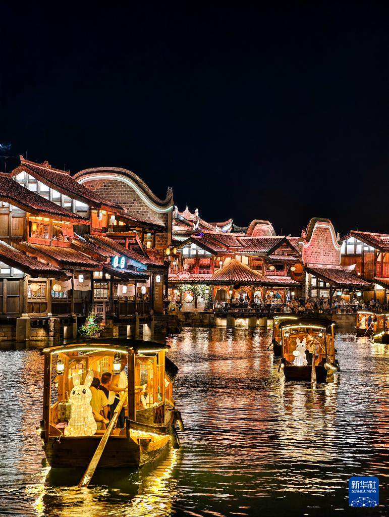 9月16日晚,在四川省宜宾市翠屏区李庄古镇,游客乘“玉兔船”泛舟慢游。