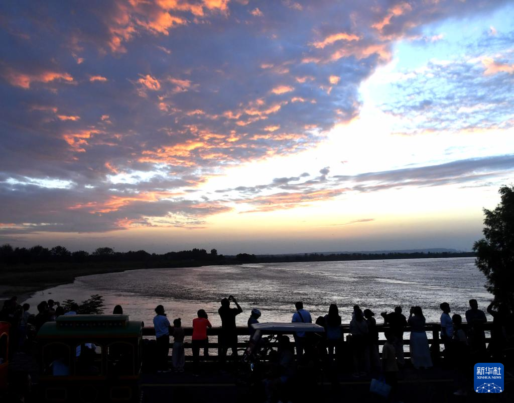9月17日,郑州黄河南裹头广场,游客观赏晚霞。