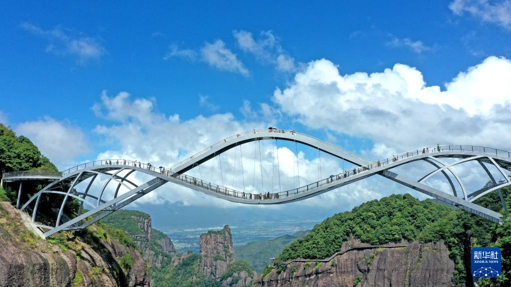 9月17日,游客在浙江省台州市仙居县神仙居景区如意桥上游玩(无人机照片)。