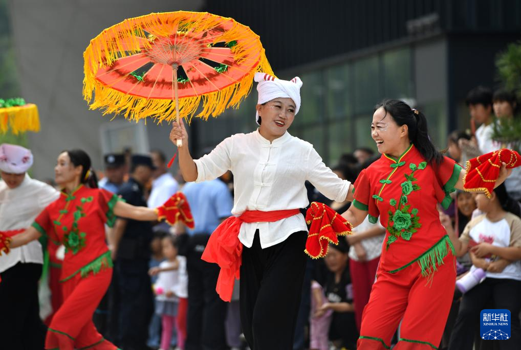 9月17日,在河北省石家庄市平山县光禄山风景区,当地群众为游客表演秧歌。
