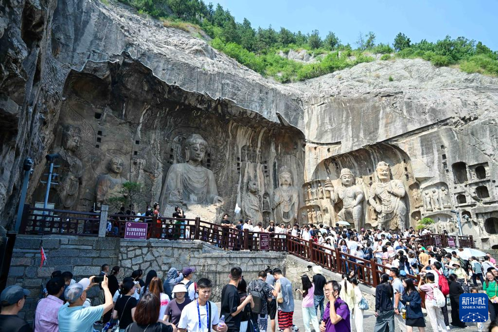 9月16日,游客在河南省洛阳市龙门石窟景区内游览。