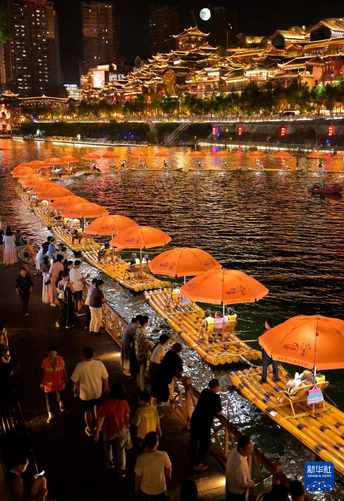 9月17日晚,游客在湖北省宣恩县城贡水河中乘坐竹筏赏夜景。