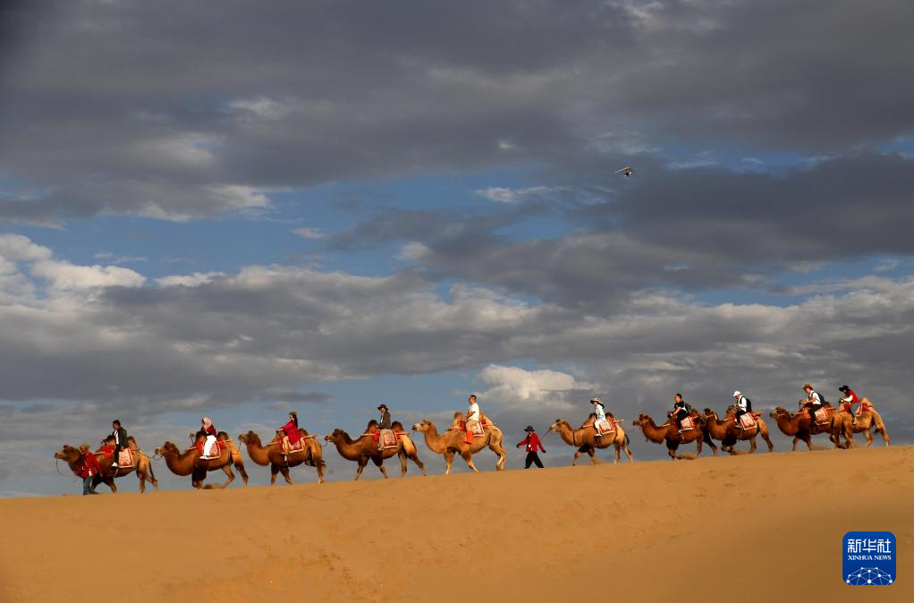 9月16日,游客在甘肃省敦煌市鸣沙山月牙泉景区游览。