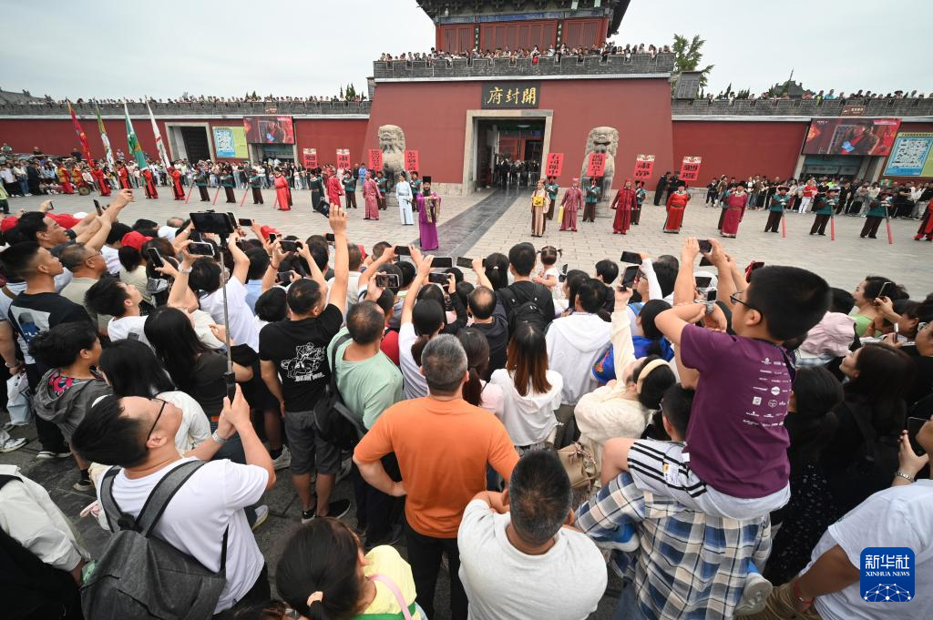 9月16日,游客在河南省开封市开封府门前观看《开衙迎宾》仪式。