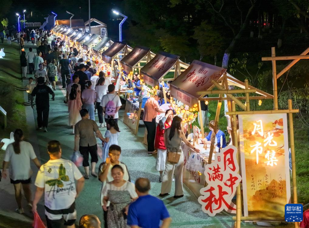 9月15日,游客在江苏省泰兴市龙河湾公园逛“月光市集”(无人机照片)。