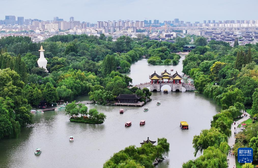 9月17日,游客在江苏扬州瘦西湖风景区游玩(无人机照片)。
