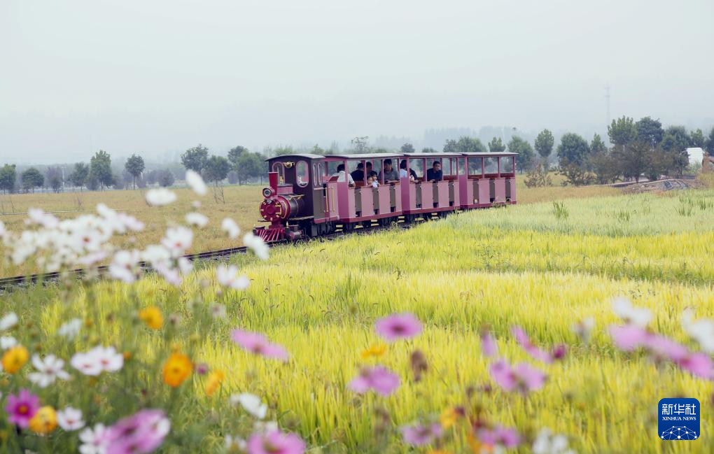 9月15日,在河南省洛阳市汝阳县三屯镇东保村“稻田小镇”,游客乘坐小火车在稻田旅游观光。