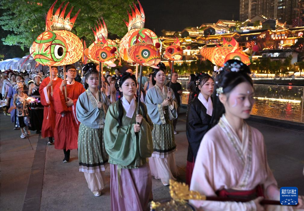 9月16日晚,在湖北省宣恩县城贡水河畔,人们身着传统服饰参加巡游活动。