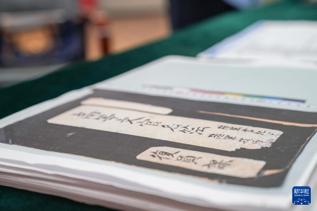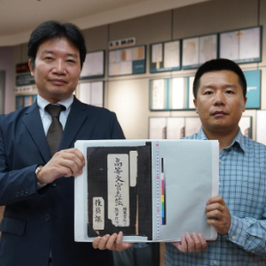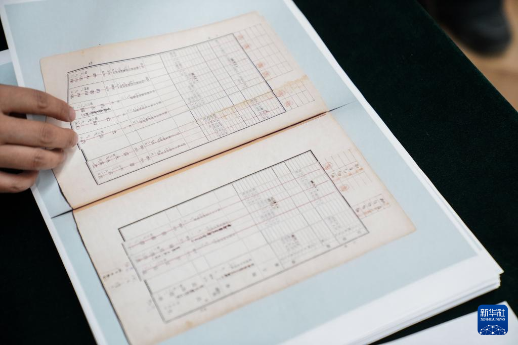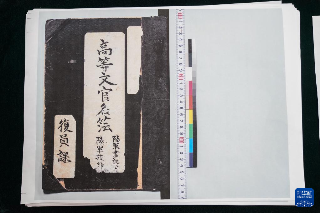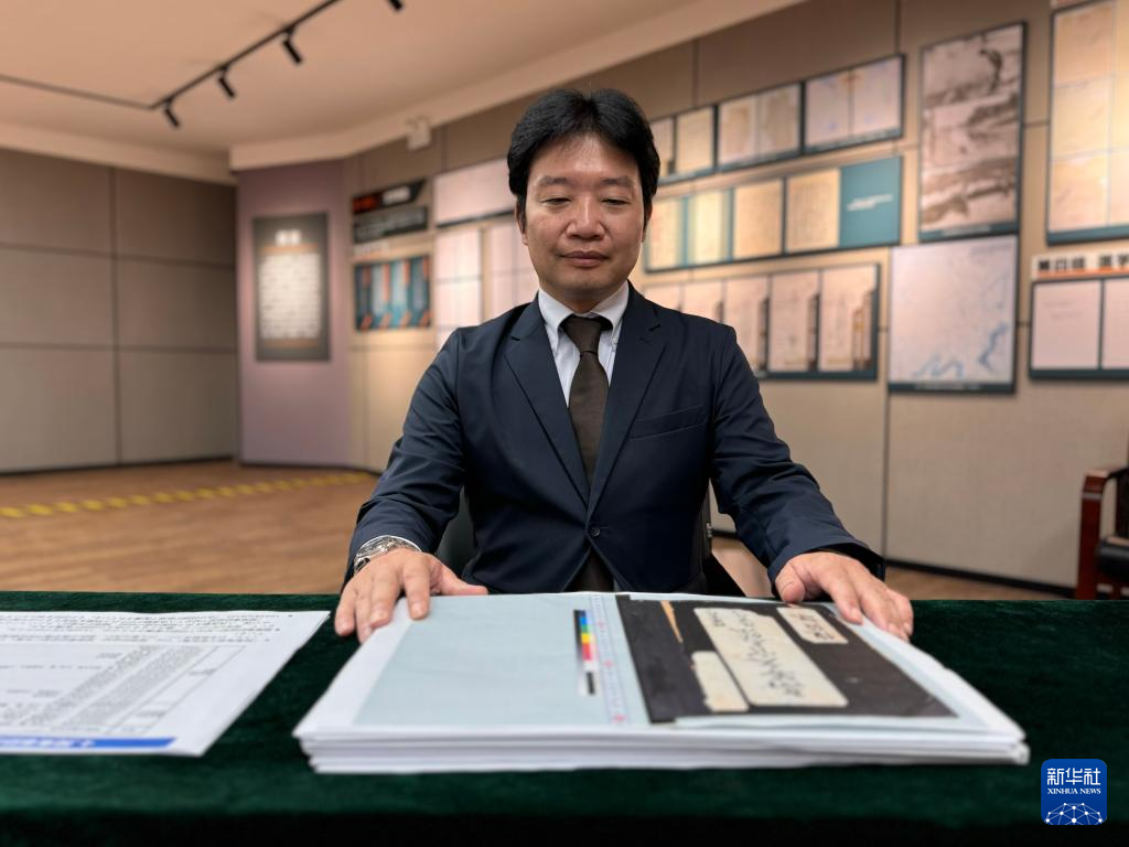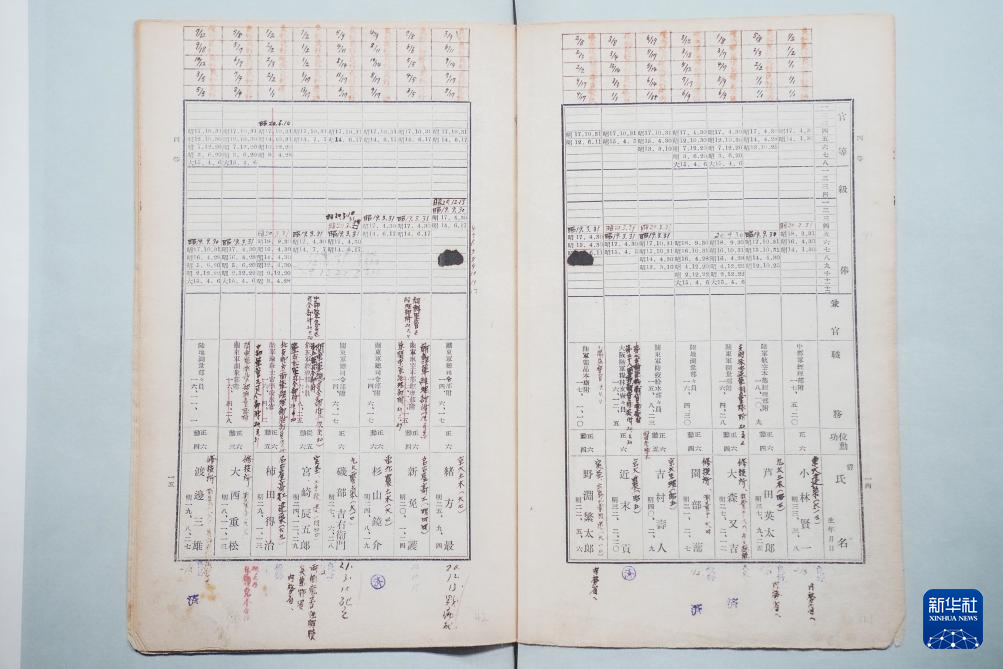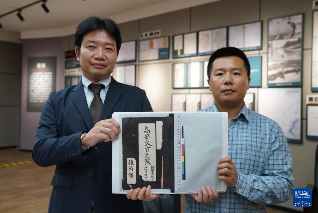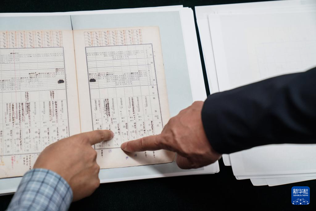 在侵华日军第七三一部队罪证陈列馆新闻中心,日本学者、黑龙江外国语学院特聘教授松野诚也(左)与哈尔滨市侵华日军细菌与毒气战史研究会副秘书长金士成展示《陆军高等文官名簿 陆军书记官 陆军技师》影印件(9月17日摄)。