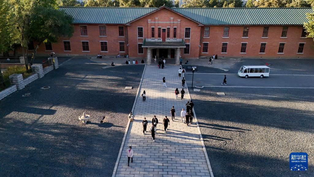 9月17日,人们前往侵华日军第七三一部队本部主楼旧址参观(无人机照片)。