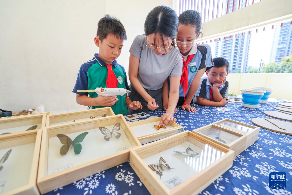 9月18日,在杭州临安区青山湖科技城第二小学科普宣传周活动现场,学生在老师带领下体验蝴蝶标本制作。