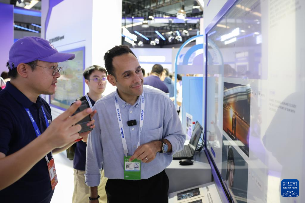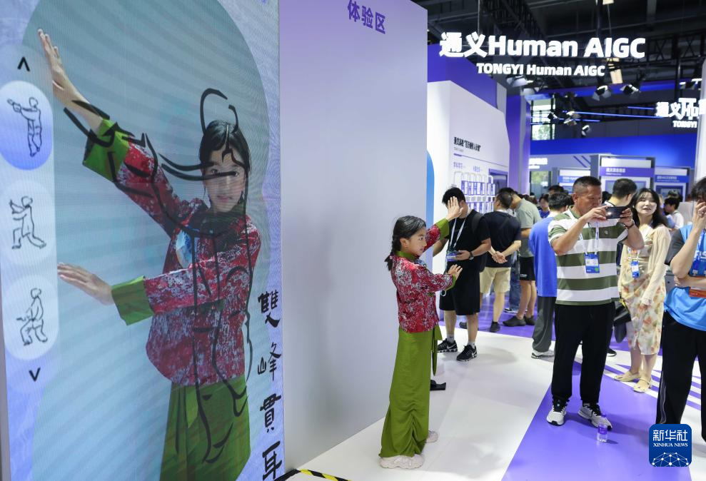 9月19日,媒体记者在“人工智能+”展馆了解AIGC视频创作应用。