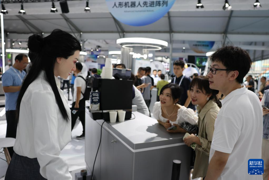 9月19日,观众在前沿应用展馆与人形机器人互动。