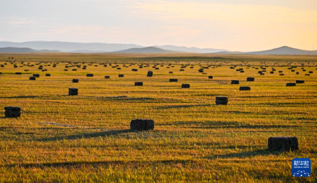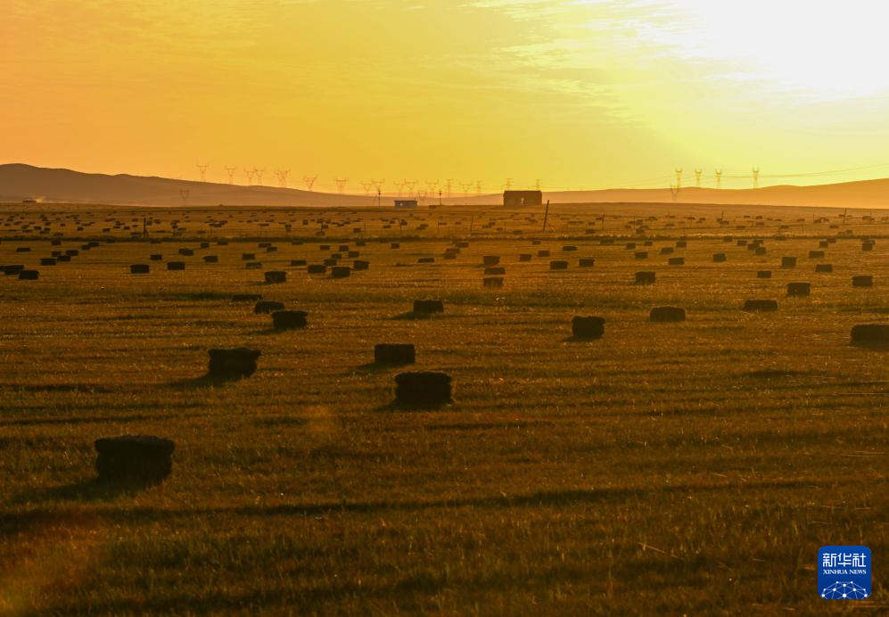 9月18日,在锡林郭勒盟西乌珠穆沁旗,已经打好的草捆摆放在草原上。