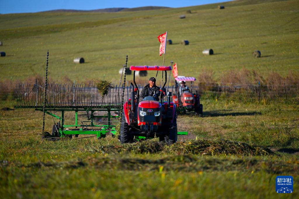 金秋时节,内蒙古锡林郭勒草原进入打草季,草原上的牧民忙着将牧草收获打捆。