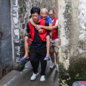 9月19日,浙江省诸暨市赵家镇泉畈村村干部和党员志愿者在台风来临前转移危旧房里的99岁老人何启林。