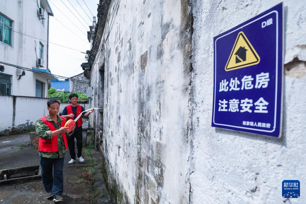 9月19日,浙江省诸暨市赵家镇泉畈村村干部和党员志愿者在台风来临前排查危旧房安全隐患,安装警示标识,提醒周边村民注意安全。