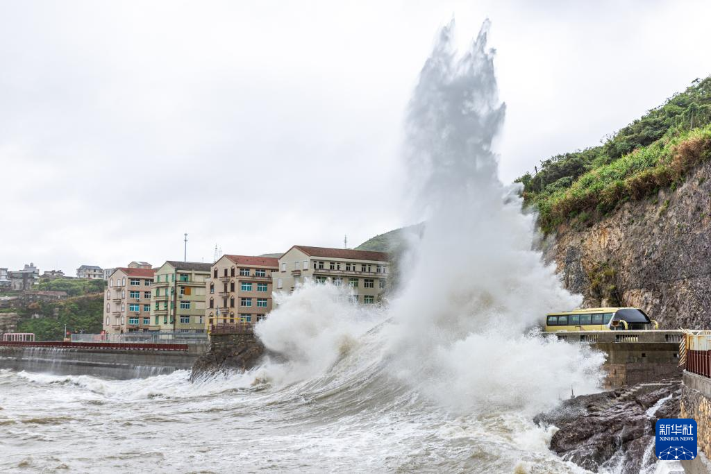 浙江省温岭市石塘镇金沙滩海域掀起巨浪(9月19日摄)。