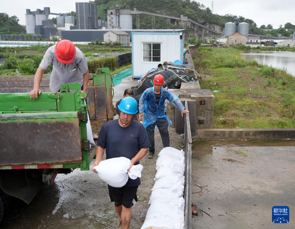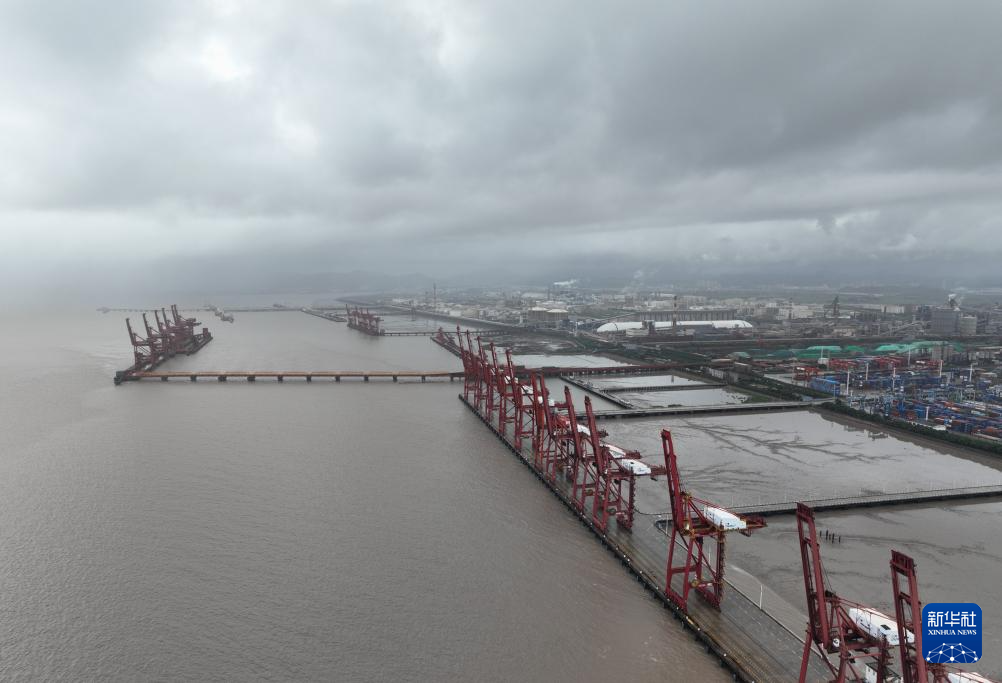 9月19日,工作人员在浙江省台州市三门县健跳镇渔港码头加固堤坝。