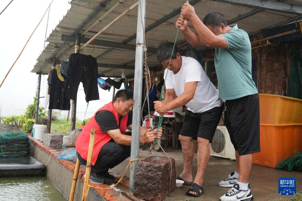 9月19日,在台州市三门县健跳镇南塘村,村干部协助养殖户加固养殖塘设施。