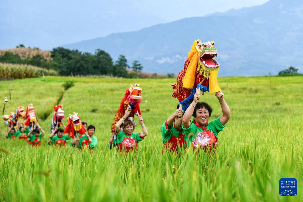 9月20日,在旱地优质稻种植示范区,当地群众抬着板凳龙在地里穿行。